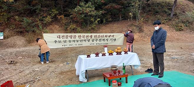 | ▲ 동학실천시민행동 회원 40 여명은 지난 30일 한국전쟁전후 남한 내 단일지역 최대 민간인집단희생지로 알려진 대전 산내골령골을 찾아 추모제를 하고 있다. |