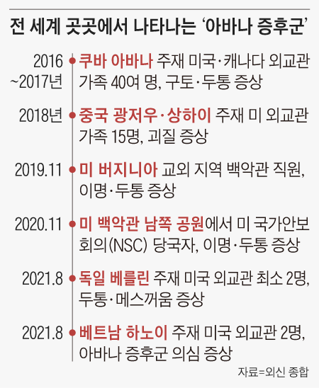2016년 쿠바 수도 아바나에 근무 중인 미국 외교관들에게서 처음 발견됐다고 해서 이런 이름이 붙었다. 쿠바 괴질이라고도 불린다. 미 정보 당국은 이 증상이 특정 세력의 ‘극초단파(microwave)’ 음향 무기 공격에 따른 것으로 보고 있다. WSJ는 “해외에 포진하고 있는 미국의 외교관 및 스파이 요원들에 대한 공격이 지속적으로 확대되고 있는 상황”이라고 했다. 최근엔 인도와 베트남에서도 관련 공격 사례가 접수된 것으로 알려졌다.