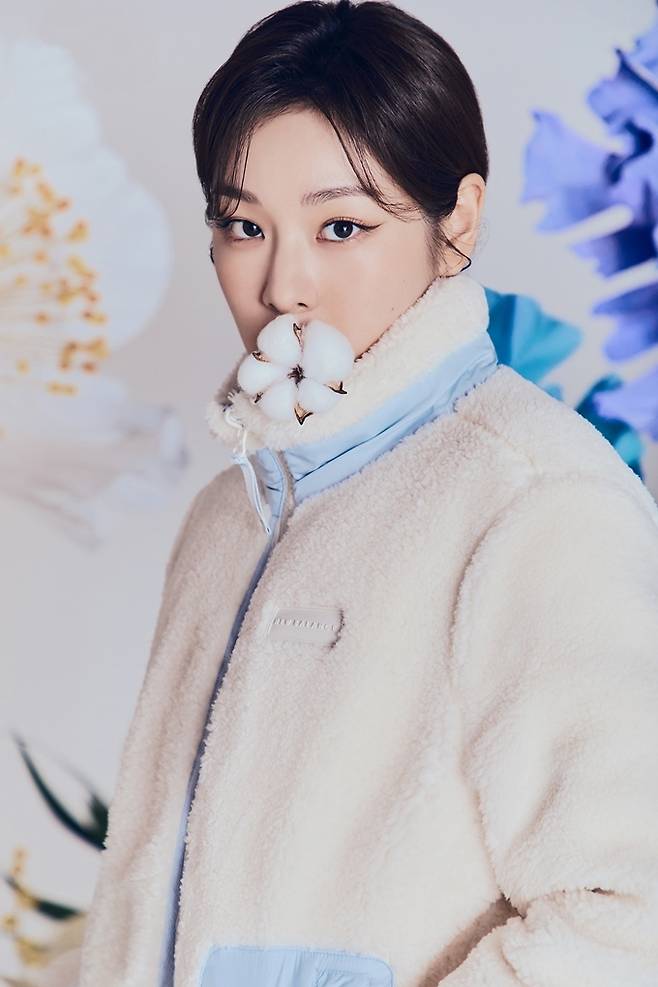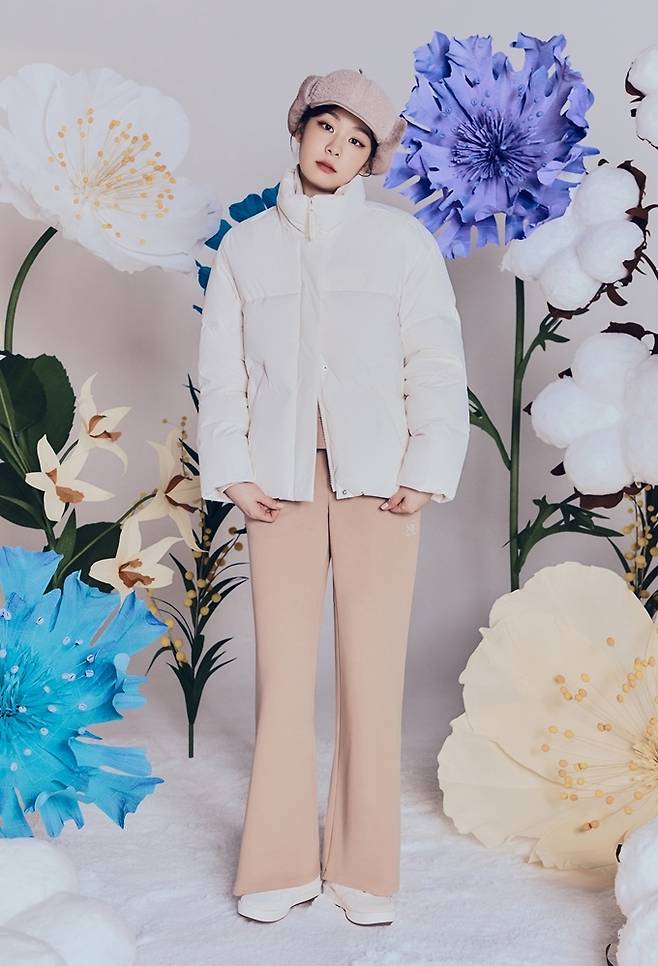 공개된 화보에서 김연아는 크롭 구스다운 점퍼와 미드 구스다운 점퍼, 플라워 리버서블 다운 점퍼, 플라워 숏 다운 점퍼 등을 착용한 다양한 스타일의 겨울룩을 선보였다.