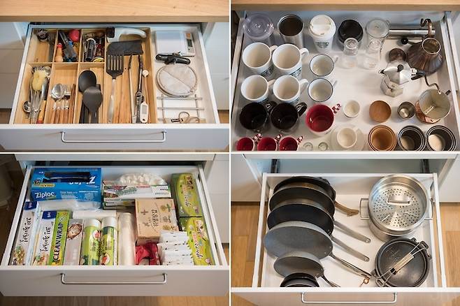 높이를 다양하게 구성해서 수납이 참 편합니다. 예전엔 자주 쓰는 스패출러, 집게 등을 넣는 공간이 서랍 안 숨은 서랍으로 구성되어 있어 너무 불편하고 싫었는데 이젠 한 눈에 잘 보입니다.