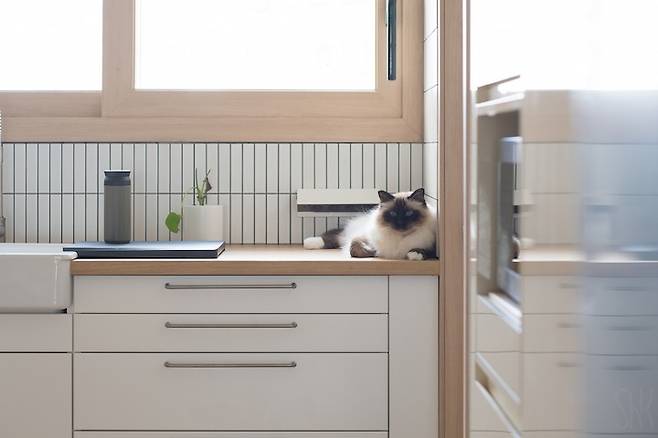우리집의 또 다른 식구도 새 주방이 썩 마음에 드는 눈치입니다. 처음엔 좀 높아서 안 올라가더니 어느새 지정석이 됐어요 ㅋㅋ 자꾸 여기에 올라가서 자리잡고 있습니다.