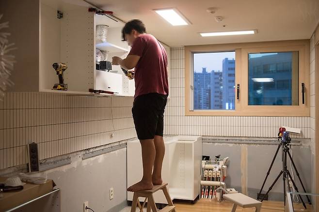 레일을 달아준 후에는 드디어 상부장부터 장착해줍니다. 상부장부터 해야 아래 걸리는 것이 없어 작업이 수월해요.