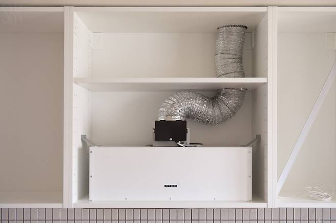 후드는 매립형으로 선택했습니다. 이거 때문에 아까 상부장에도 구멍을 내 준 거지요. 일체감 있는 마감을 위한 선택입니다.