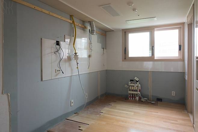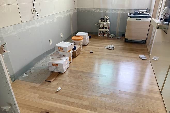 기존은 어정쩡한 ㄷ자였지만, 새로 할 이케아 주방은 ㄱ자로 설치할거라 비어있는 마루를 메워줘야 해요. 사진처럼 많이 비었던 건 아니고, 마루 패턴을 맞추려 어중간하게 걸친 부분을 뜯어내다보니 이렇게 됐습니다.
