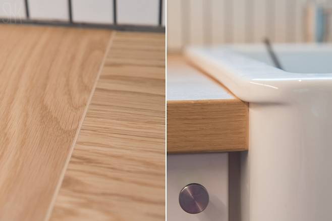 상판과 상판이 만나는 곳은 틈이 생겨요. 그러니 마스킹 테이프를 붙이고 비슷한 우드 색 실리콘을 쏴줍니다. 매우 깔끔한 마감 라인을 가질 수 있어요.