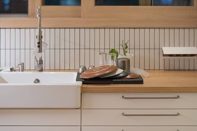 싱크볼은 하브센으로 상판에 매립하여 넣어줬습니다. 도기 한 번 써보고 싶었던지라...ㅎㅎ 이것보다 큰 사이즈도 있지만 둘 밖에 없는 집이라 차고 넘치는 사이즈입니다.