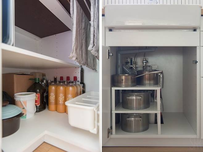 자주 쓰는 냄비들은 선반 인서트를 포개어 보관. 싱크대 바꾸면서 배수 트랩도 더 슬림해져서 공간이 훨씬 많이 생겼네요.