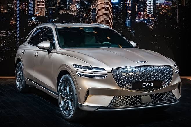 제네시스 GV70 전기차의 실물이 공개됐다. 중국 자동차 전문매체 오토홈은 중국에서 개최된 광저우 모터쇼에 전시된 GV70 전기차를 게재했다. GV70 전기차는 내연기관 파생 모델로 전기차 전용 디자인이 적용됐다. 1회 완충시 최대 400km를 주행한다. 국내 출시는 내년이다.