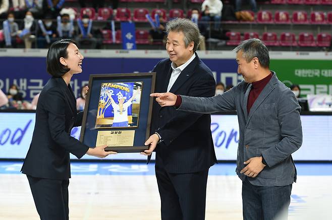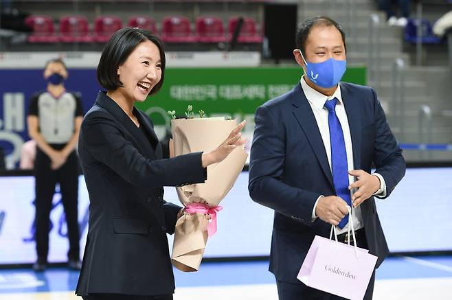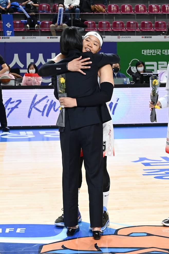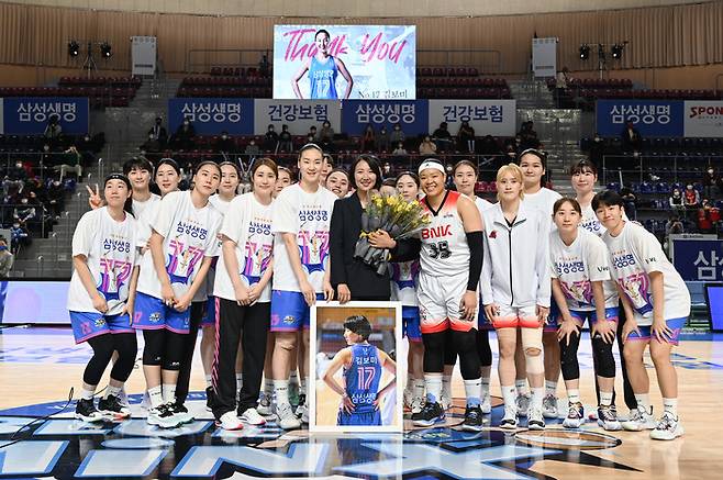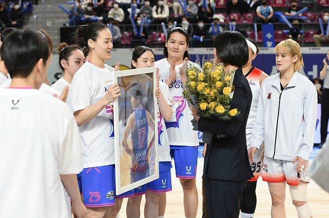 전반전이 끝난 후 헌정 영상을 시작으로 본격적인 은퇴 행사가 시작됐다. 정진경 WKBL 경기본부장이 황금열쇠 등 기념품을 전달했고, 이어 김재산 삼성생명 단장, 임근배 감독의 기념액자 전달식이 이어졌다.