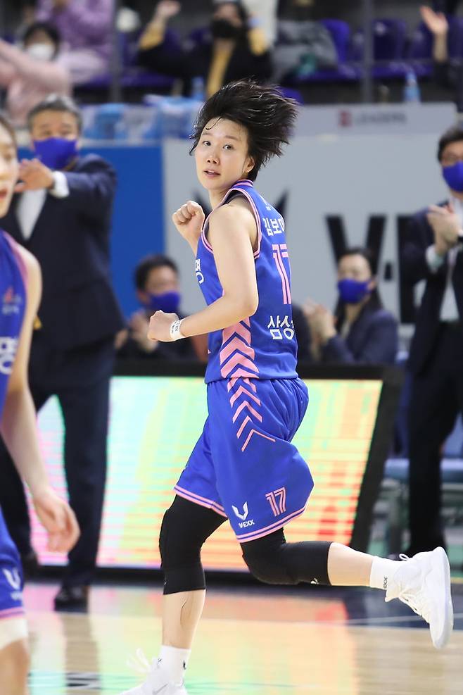 3일 용인체육관에서 열린 삼성생명 2021-2022시즌 여자프로농구 용인 삼성생명과 부산 BNK 썸과의 경기 하프타임에는 뜻 깊은 행사가 거행됐다. 여자프로농구 무대에서 17년 간 활약한 김보미의 은퇴식이었다.