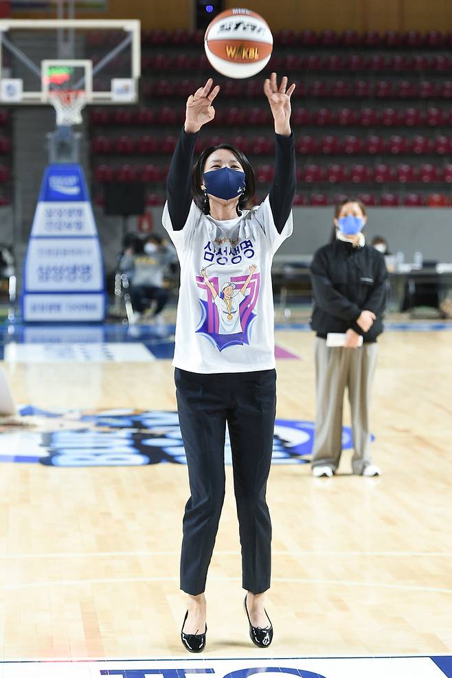3일 용인체육관에서 열린 삼성생명 2021-2022시즌 여자프로농구 용인 삼성생명과 부산 BNK 썸과의 경기 하프타임에는 뜻 깊은 행사가 거행됐다.