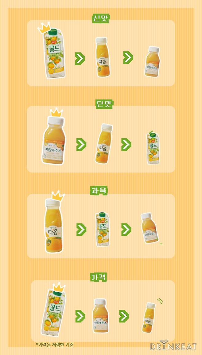 이에 세 가지 오렌지주스를 낱낱이 파헤치는 시간을 가져봤다. 제품 선정 기준은 ① 어느 마트에서나 볼 수 있고 ② 대중들에게 꾸준한 사랑을 받아왔으며 ③ 에디터의 1차 맛 관문을 통과한 제품이다. 어떤 제품을 구매해야 할지, 선택에 고민이 있었던 사람들은 주목!