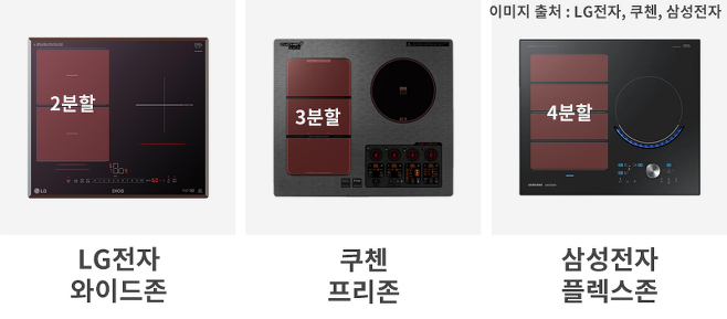 각 제품들의 프리존 기능은 화구가 나뉘어진 정도에 따라 차이가 있는데요. 적게는 2개부터 많게는 4개까지 나누어져 있습니다. 화구가 좀 더 작게 쪼개져 있을수록 더 작은 용기를 쓰고 싶을 때 효율적으로 사용할 수 있고, 놓는 위치를 덜 신경써도 됩니다.