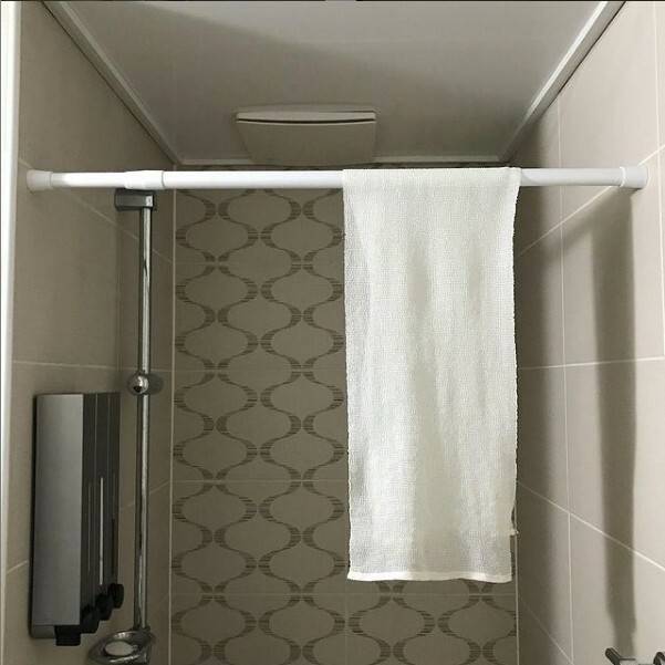 마찬가지로 샤워타월도 공중부양을 해주었어요.욕실 안에 있는 기둥을 샤워부스 삼아 압축봉을 이용해 공간을 분리해 주었어요. 이곳에 샤워타월을 걸어 건조를 해줘요. (지금은 아크릴이 아닌 삼베 샤워타월을 이용 중)
