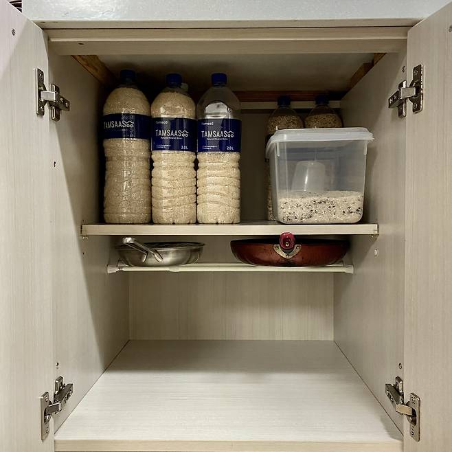 주방 하부장 왼편엔 쌀과 조리도구를 수납했어요. 페트병에 쌀을 담아 벌레가 생기는 것을 방지했고 필요한 만큼만 한 병씩 쌀통에 꺼내어 먹었어요. 아래쪽은 압축봉으로 공간을 분리하여 선반처럼 활용했고 압축봉 위에 프라이팬을 두고 아래쪽엔 냄비를 수납했어요. (사진엔 냄비가 빠져있는 상태)