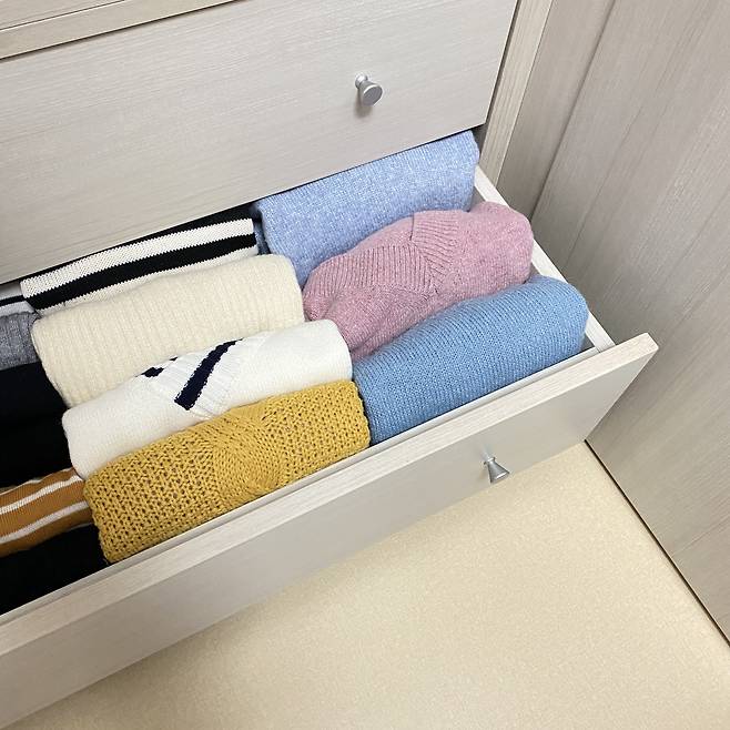 붙박이장 서랍엔 나의 스웨터들을 접어 정리수납했어요. 한눈에 보아도 알 수 있도록 전면이 위로 올라오도록 접었고 꺼내고 넣을 때 모양이 흐트러지지 않도록 세워서 수납했답니다.