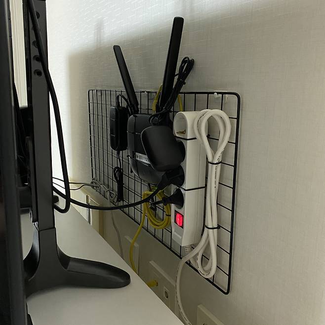 효율적인 가구 배치를 위해 벽걸이 tv는 설치하지 않았는데요. 스탠드형으로 두어 언제든 옮길 수 있게 하였고이 선택은 4년간 5번 이상의 tv 이동의 결과를 가져왔어요.벽걸이 tv는 아니었지만 tv 선이 주렁주렁 매달린 건 싫었기에 다이소에서 네트망과 케이블 타이를 구입해 정리해 주었어요.꼭꼬핀으로 고정시킨 거라 위치 이동도 부담 없이 할 수 있어요.