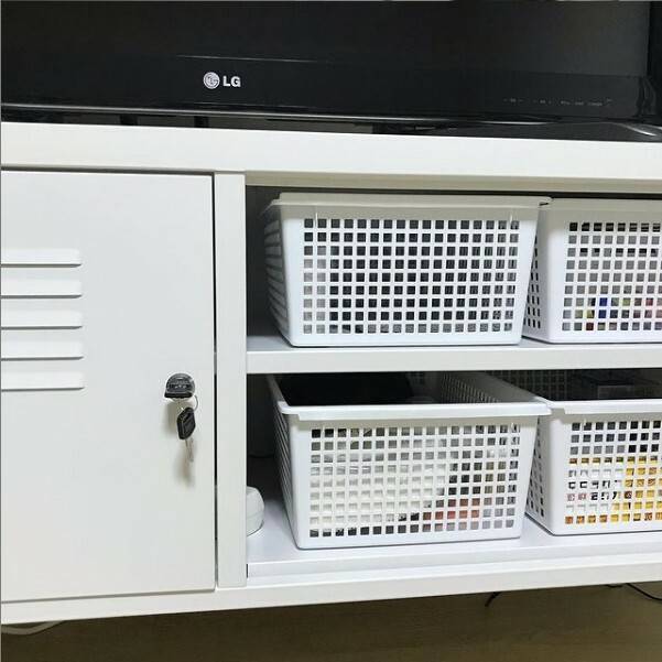 각종 잡동사니들은 tv 밑 철제 선반에 수납해 주었어요. 화장품, 의약품, 손톱깎이 등 부피가 작은 모든 물품들은 한곳에 수납하여 찾기 쉽도록 했어요. 수납함은 전부 화이트로 통일하여 깔끔해 보이도록 했어요!