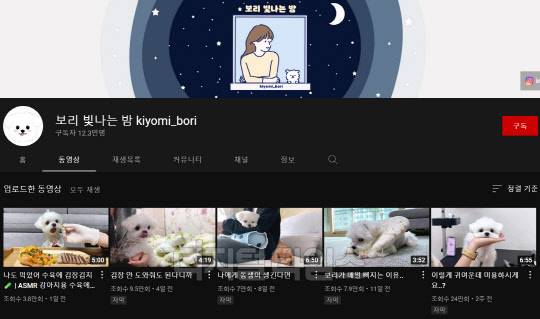 1위인 '보리 빛나는 밤'은 구독자 수 12만 1000명, 누적 조회 수 4000만 회를 보유하고 있는 채널이다. 작은 체구에 빼꼼 내민 혀가 매력적인 말티즈 강아지 '보리'가 가족과 함께 소소한 일상을 보내는 모습을 영상에 담아 선보인다. 채널 내 가장 인기 있는 영상('리트리버한테 뺨 맞고 개빡친 말티즈')은 800만 회에 가까운 조회 수를 올리고 있으며, 조회 수 100만 회 이상을 기록하는 영상만 10여 개에 달한다.