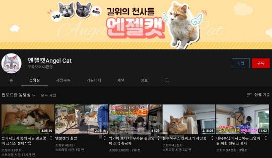 2위는 구독자 2만 6천 명, 누적 조회 수 1만 회의 기록을 보유하고 있는 채널 '엔젤캣'이다. 위험에 처한 길고양이들을 구조하고 보살피는 과정을 생생하게 담은 영상들을 선보여 많은 애묘인의 응원과 지지를 받고 있다.