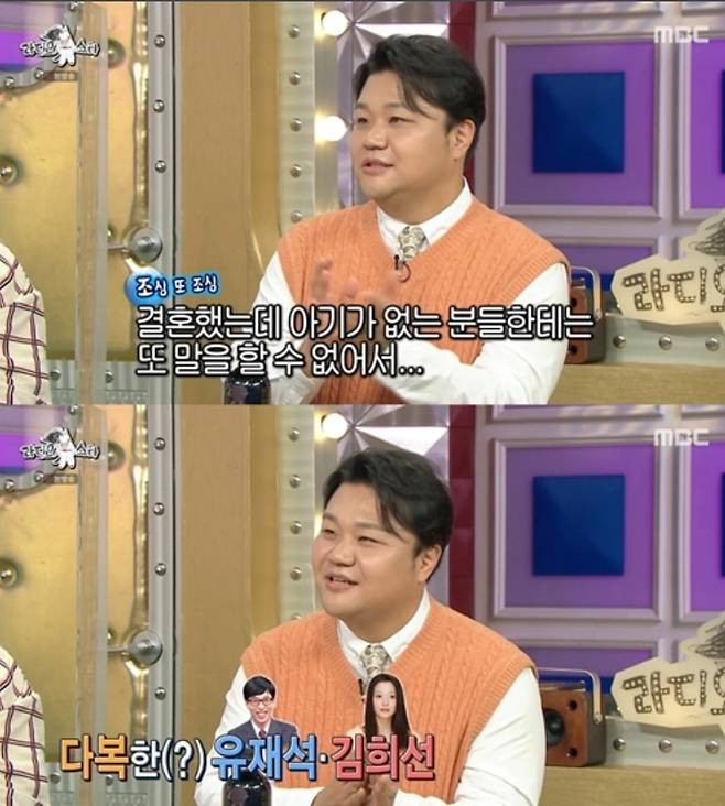 그는 한 예능프로에 출연해 "결혼을 안 한 분들에 알리기도, 결혼 후 아이가 없는 분들에게 알리기 그랬다"라며 "유재석, 김희선, 이수근, 김기방에게 작게 알렸다. '저 이렇습니다' 알리기 부끄럽더라"라고 설명 했습니다.