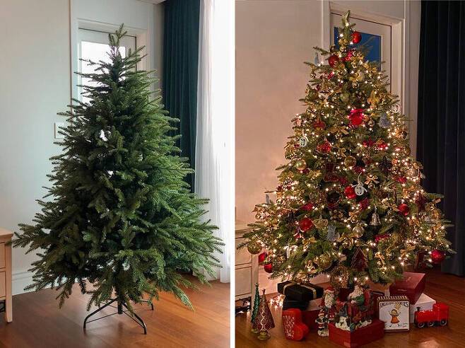막상 트리를 구매하려고 온라인이든 오프라인이든 탐색하다 보면, 너무나 다양한 종류에 결정이 힘들다. 본인 취향의 모양과 크기를 대충 정하고 돌아다니는 것이 좋다. 키는 둘 다 210cm이지만 두 트리가 확실히 다른 스타일이라는 걸 캐치할 수 있다.