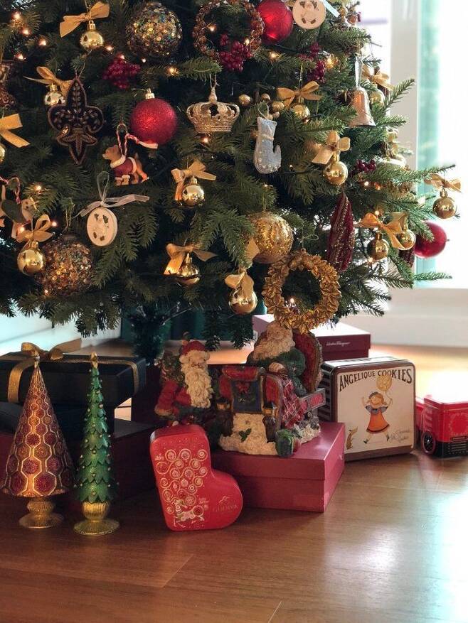 천으로 된 트리스커트를 두르거나 바닥에 러그를 깔고 트리를 세우는 경우도 있는 듯 한데, 나는 선물박스와 크리스마스 오브제로 장식하곤 한다. 예쁜 구두박스 같은 건 버리지 않고 두었다가 트리 밑에 놓아두는 것도 좋은 방법.