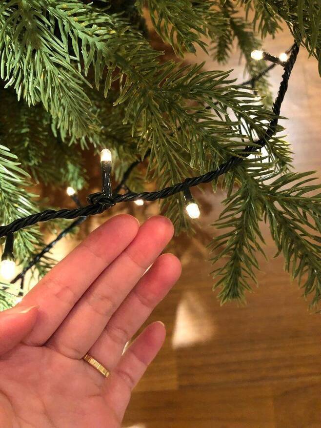 또한, 조금 번거롭더라도 가능한 한 촘촘하게 많은 수의 전구를 다는 게 예쁘다. 나는 180cm 트리에 일반 녹색선 전구 500구짜리 두 통(총 1,000구)을 감았다. 작년 150cm 트리에도 같은 양을 달았었는데, 180cm에는 세 통 정도 감아도 좋겠다는 생각이 든다. 내년엔 한통 더 사서 감아야지.