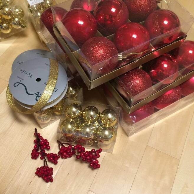 고속버스터미널 조화상가에 가 보는 것을 추천! 기본적인 레드, 골드, 실버 색상의 볼이나 볼 위에 달아줄 리본 등을 구하기 좋다.
