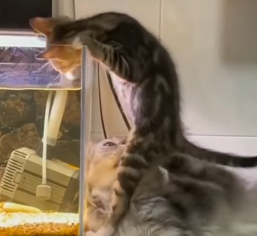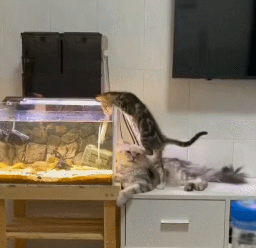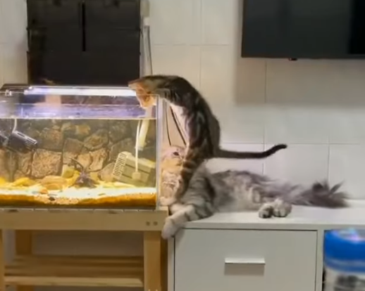 어항에 올라타며 관심을 보이고 있어요!