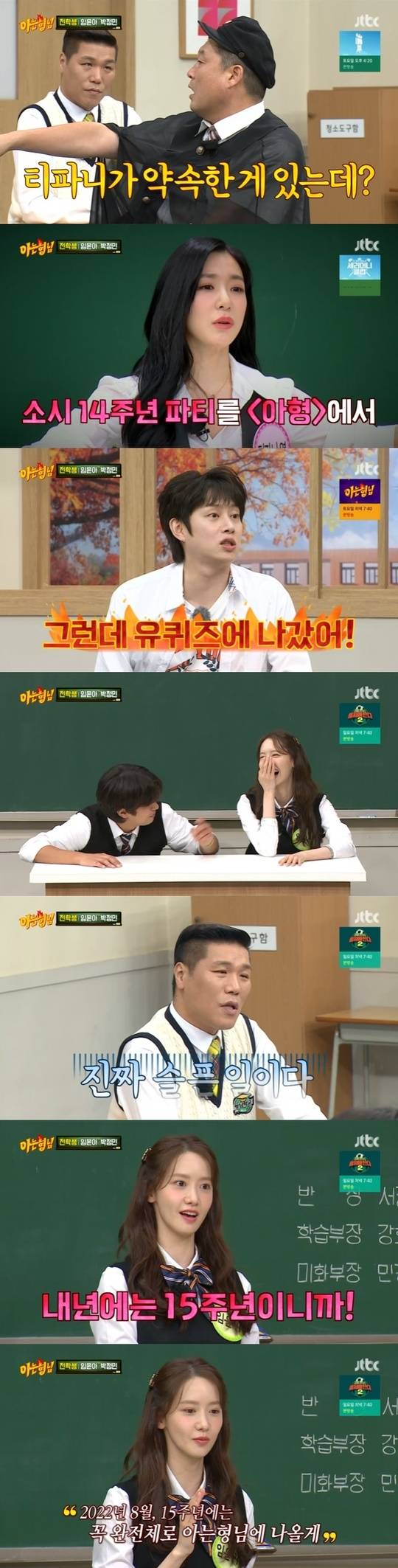이런 아는형님들의 대화에 내내 민망한 웃음만 짓고 있던 윤아는 "내년에는 15주년이니까 더 기념적일 때, 2022년 8월 15주년엔 멤버들과 '아는 형님' 나오겠다"고 약속했다.