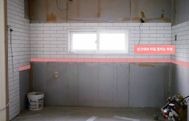 '타일은 상부장과 하부장 사이에 붙이는거 아니에요? 그럼 싱크대 달고 해도 되는거 아닌가?'라고 생각하실수도 있지만 No! 타일은 싱크대 설치 전에 완료 되어야 합니다. 하부장 뒷면에 타일을 붙이지 않으면 사용하면서 물이 들어가 곰팡이의 원인이 되거나 하부장 뒷면이 썩을 수 있어요. 보다 깔끔한 마무리를 위해서도 타일이 먼저 작업 되는 것이 좋구요.