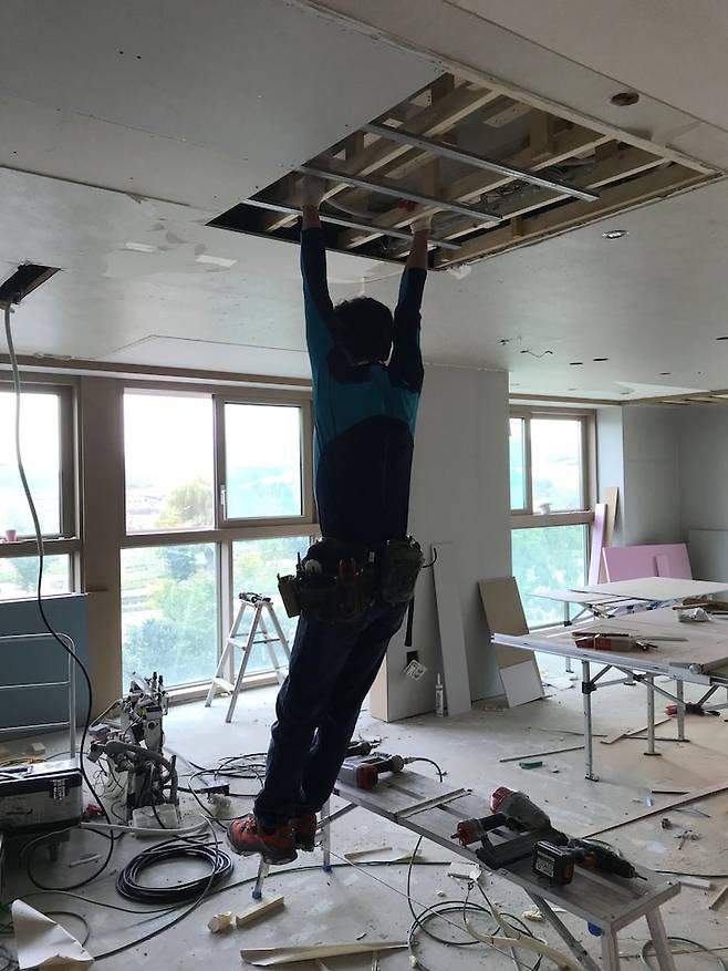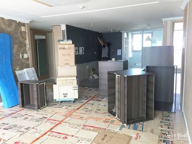 설비(환기, 수도) → 전기(배선) → 목공 →타일 → 필름 →도배 →바닥 → 싱크대 설치→조명과 콘센트 달기
