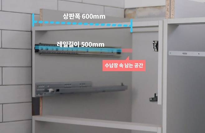 일반적인 상판 폭 600mm로 시공시 서랍장 내부의 정상적인 여백