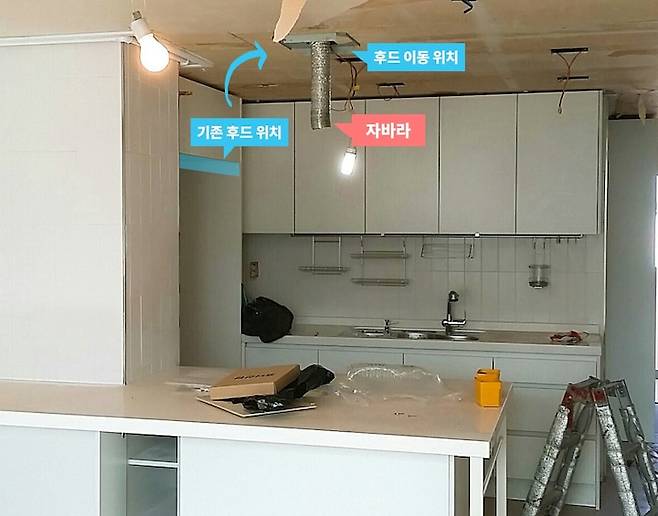 조리기구를 대면형으로 옮긴다면 체크해야할 것이 또 하나 있습니다. 바로 환기설비-후드 시공이에요.