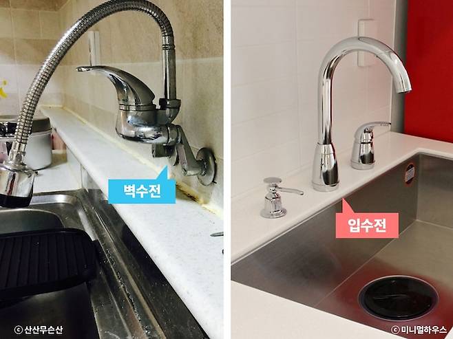 싱크볼의 위치를 바꾸는 경우는 수도 설비 부분을 먼저 검토해야 합니다. 대면형으로 만들면서 새로 생기는 면으로 옮기는 경우에는 바닥을 가로질러 수도관을 빼주어야하기 때문에, 반드시 전문가의 손길이 필요해요. 바닥을 뜯고 배관 작업이 이루어져야 합니다. 벽수전*을 입수전*으로, 입수전을 벽수전으로 변경하는 경우에도 수도 배관 작업이 필요합니다.