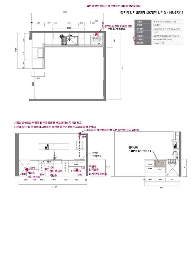 오늘의집 유저분들의 싱크대 시공 사례를 보면, 싱크 업체에서 철거 후 실측을 통해 정해진 여러 사항들을 도면에 표시해서 연관 공정 담당자가 볼 수 있도록 준비해주신 경우가 많아요. 싱크 업체에 이러한 도면을 받을 수 있다면 베스트! 만약 정확한 도면 전달이 어려운 경우라면 내가 직접 간단한 그림이라도 그려서 전달하는 것이 좋습니다.