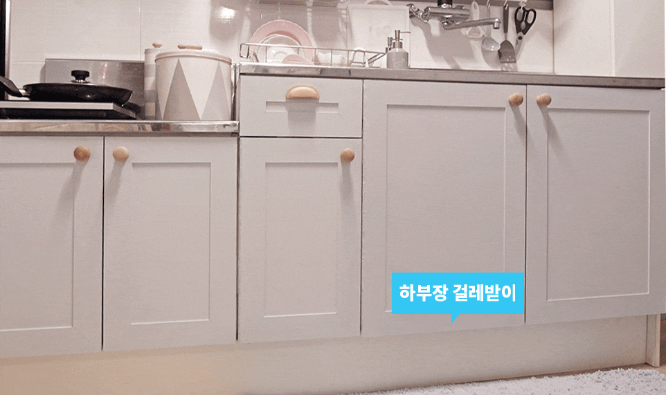 싱크대 아래 걸레받이의 경우 사진처럼 약간 위에서 봤을 때는 틈이 보이지 않는 것이 정상이지만, 고정 방법에 따라 0.5cm 정도의 틈은 생길 수 있어요. 너무 크게 공간이 생겼거나, 고정이 되지 않아 잘 움직이는 경우는 시공자에게 말씀하셔서 싱크대 아래 부분이 잘 막아질 수 있도록 챙겨주세요.