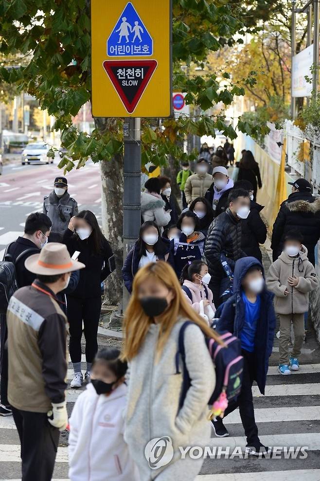 (서울=연합뉴스) 수도권을 포함한 전국 학교가 전면등교를 시작한 22일 서울 용산구 금양초등학교에서 학생들이 등교하고 있다. 2021. 11. 22 [사진공동취재단]