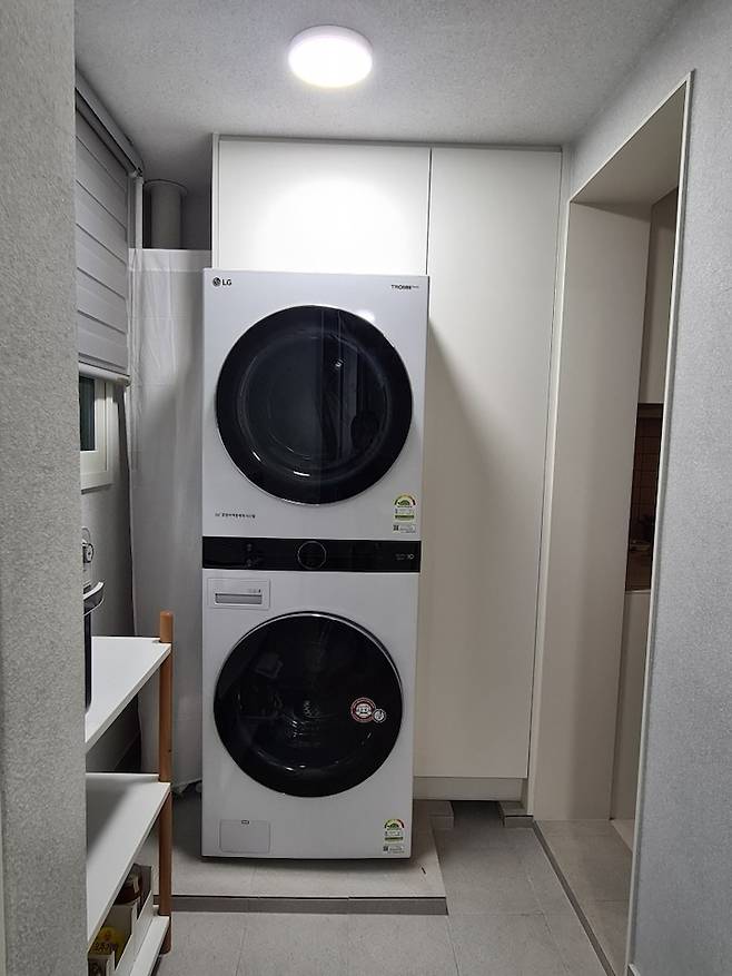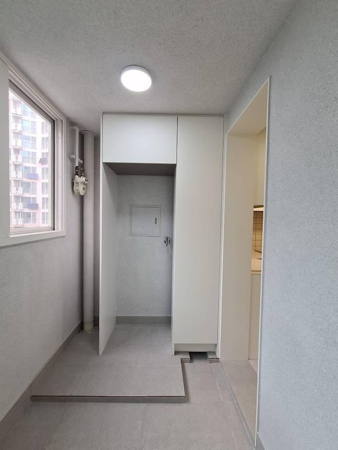 세탁기 양쪽으로 세탁장을 다 짜서 수도관까지 깔끔하게 가리고 싶었지만 창문과 슬라이딩 도어쪽의 단차로 인해 한쪽으로 밖에 세탁장을 못 짰어요. 하지만 이마저도 완전 만족합니다.