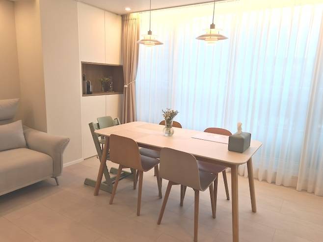 그 대신 식탁은 거실로 빼서 널찍하게 사용하고 있어요. 거실로 식탁을 빼면 불편하지 않냐는 질문을 많이 받았는데, 30평 초반대의 공간에서, 그것도 주방과 거실이 그닥 넓지 않은 공간의 아파트이기에 (안방이 너무 큰 우리집...ㅎㅎ) 불편함 없이 지내고 있어요.