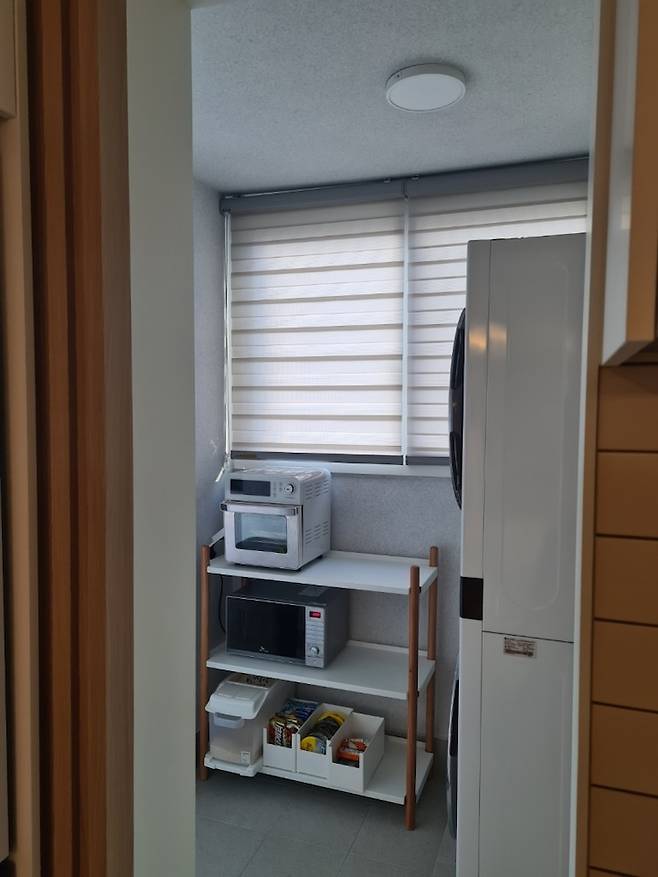 펜트리가 대세라던데... 좁은 주방에서 펜트리는 생각조차 할 수 없었쥬... 그 대신 확장하지 않은 베란다를 최대한 활용하기로 했어요. 슬라이딩 도어를 열고 나가면 이런 공간이 나와요.