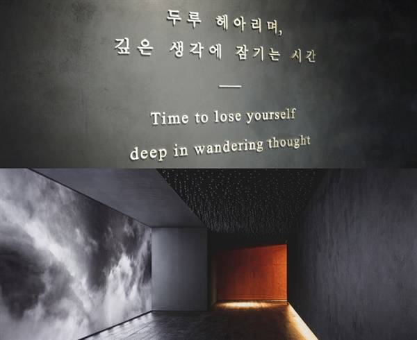 하늘에는 별이 빛나고 구름이 바람처럼 스치는 이 영상은 태초의 천지를 연상시킨다. 진입로가 좀 긴 건 어둔 실내에서 서서히 익숙해지는 '전이공간'의 매체 효과를 내려 한 것이란다.