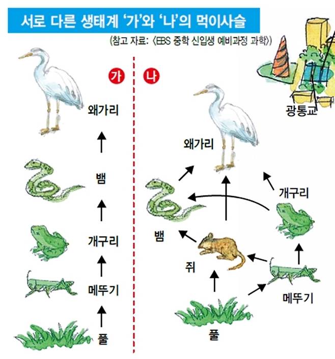 왜 이렇게 종 다양성을 높이려 애쓰는 걸까? 여기서 퀴즈 하나. 중학교 신입생이 푸는 문제다. 기사 위쪽에 있는 그림은 서로 다른 생태계 ‘가’와 ‘나’의 먹이사슬을 나타낸 것이다. 어느 쪽이 생물 다양성이 높아 더 안정적으로 유지되는 생태계일까. 답은 ‘나’. 먹이사슬이 복잡해지면 멸종 위험이 줄어들고 생태계 안정성이 높아진다.