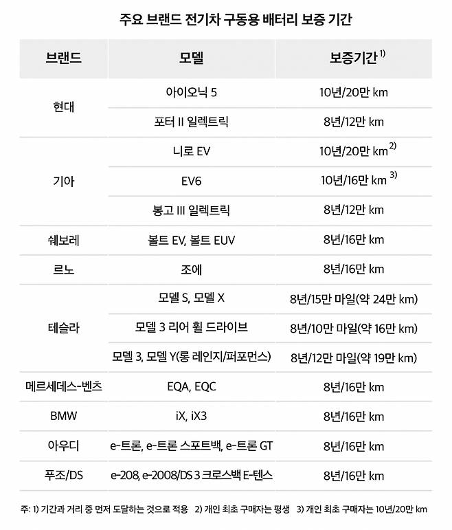이와 같은 특성 차이 때문에, 전기차의 배터리 수명은 스마트폰보다는 훨씬 더 길다. 이는 주요 브랜드 전기차의 보증기간에서도 확인할 수 있다. 많은 전기차 제조회사는 보증기간에 구동용 배터리 충전 전력량의 70% 이상을 유지하는 것을 보장한다. 즉 보증기간 내에 배터리 성능이 30% 이상 떨어지지 않는다는 뜻이다. 그런 기준을 충족하는 보증기간은 대개 8년/16만 km고, 일부 업체는 10년/20만 km 혹은 그 이상을 제시하기도 한다.