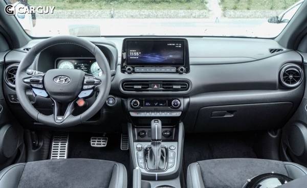 실내는 기존 코나에서 디테일을 매만졌다. 10.25인치 계기반에는 N 전용 그래픽을 심어 주행에 필요한 RPM이나 차량의 각종 정보를 한 눈에 보기 쉽게 했다. 10.25인치 센터 디스플레이 역시 N 메뉴가 추가됐다. 주목할 부분은 벨로스터 N과 달리 트랙 주행시 트랙의 랩타입을 확인 할 수 있는 모드가 추가된 점이다. 별도 장비 없이 실시간으로 브레이크와 가속 페달을 밟는 양 등도 확인 할 수 있다. 스티어링휠에도 많은 변화를 거쳤다. 자신이 설정한 주행 모드로 진입할 수 있는 버튼이 두 개가 마련됐다. 각각의 설정을 입맛대로 설정해 주행 환경에 따라 모드를 손쉽게 오갈 수 있다. 스티어링휠 오른쪽 하단에 자리잡은 붉은 버튼을 누르면 NGS가 활성화된다. 20초 동안 최고출력 290마력의 힘을 쥐어 짠다. 어떤 모드에 있더라도 최고의 성능을 맛 볼 수 있다. 이 외에 N전용 스웨이드와 천연 가죽으로 씌운 시트가 마련되며, 1열은 전동 기능과 열선 및 통풍 기능까지 지원한다.