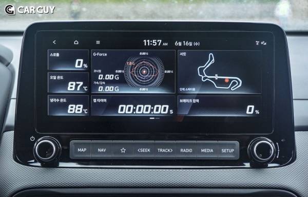 노말모드로 바꾸고 가속을 하면 의외의 정숙(?)함이 느껴진다. 요즘말로 하면 ‘힘숨찐’이랄까. 겉모습만 보면 일반적인 코나와 큰 차이가 없지만 N모드로 바꾸고 가속을 진행하면 우악스러운 출력을 내뿜는다. 특히 5000rpm 부근까지 가속을 하고 악셀에서 발을 떼면 배기구에서 일명 팝콘이 터진다. 일상주행과 스포츠 주행을 단 순간에 뛰어 넘는 세팅이다. 모드를 바꾸는 법은 간단하다. 스티어링휠에 있는 N 커스텀 모드를 누르면 된다. 일순간에 더 많은 출력을 필요로 한다면 스티어리휠에 붙은 빨간 버튼을 누르면 된다. 어렸을 적 즐겼던 레이싱 게임이 떠오른다. 버튼을 누르면 NGS가 활성화된다. 20초간 최고출력 290마력의 힘을 일순간에 내뿜는다. 정지상태에서 시속 100km까지 단 5.5초만에 끊어내는 단거리 경주마다. 공도 시승을 마치고 서킷에 들어섰다.
