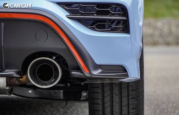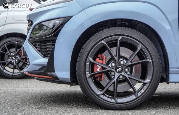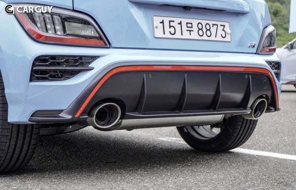 개인적으로 코나N 디자인은 불호에 가까웠다. 괴상한 전면 그릴과 아래 위로 나뉜 주간 주행등과 헤드램프까지 뭔가 부조화스러운 느낌이다. 새롭게 마주한 디자인은 "부분변경을 거친 것이 아닐까"라는 생각이 들만큼 변화를 줬다. N 전용 라디에이터 그릴과 현대 로고는 블랙으로 치장했다. 커다란 현대 로고가 노말 버전에선 부각되지만 N에선 그릴과 한 몸 인듯 위장했다. 벨로스터 N에서도 볼 수 있듯 붉은색 포인트로 힘을 준 프론트 립 스포일러와 사이드 실 몰딩, 후면 범퍼 디테일이 조화롭다. 19인치 단조 휠은 무게가 가벼울 뿐 아니라 강성까지 확보했다. 휠 안쪽에 심은 대용량 브레이크 캘리퍼가 레드 컬러다. 서 있는 상태에서도 강력한 아우라를 뿜어낸다. 후면부는 고성능 모델임을 뽐내듯 더블 윙 타입의 스포일러와 N 전용 삼각형 모양의 보조 제동등이 후면 유리 상단에 자리한다. 후면 범퍼 하단에는 공기의 흐름을 다스리는 디퓨저와 구경이 상당히 큰 머플러가 좌우에 각각 하나씩 위치한다. 실용성을 더하기 위해 루프랙도 빼먹지 않았다.