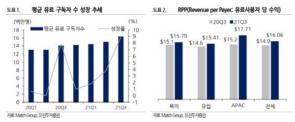 황성현 유진투자증권 연구원은 “힌지와 틴더 서비스는 매출액 성장에 가장 크게 기여했다”라며 “여기에 아자르를 개발한 하이퍼커넥트를 인수한 덕에 아시아에서의 유료 사용자당 수익이 전년 동기 대비 17% 늘어났다”라고 설명했다.