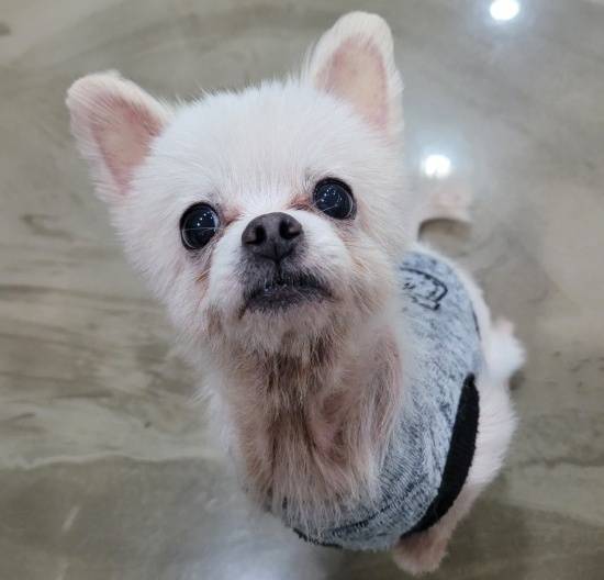현재는 온몸의 발적과 곰팡이성 피부염은 호전되었고 털도 듬성듬성 했었는데 털도 잘 자라고 있답니다~ 아직은 분홍색 모색이지만 관리를 열심히 해준다면 다시 하얀 모색을 가지게 되지 않을까 생각됩니다!